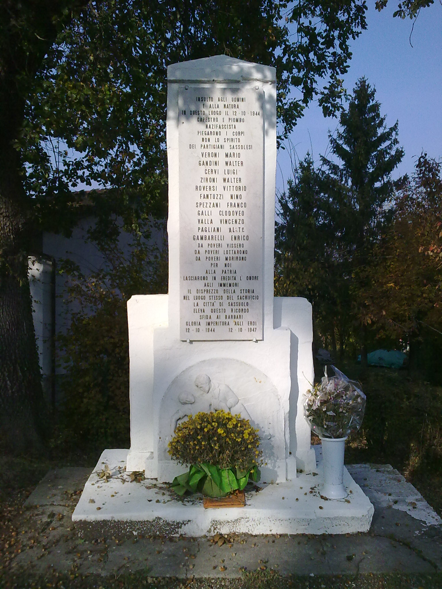 «INSULTO AGLI UOMINI/ E ALLA NATURA/ IN QUESTO LUOGO IL 12-10-1944/ CAPESTRO E PIOMBO/ NAZIFASCISTA/ PIEGARONO I CORPI/ NON LO SPIRITO/ DEI PARTIGIANI SASSOLESI/ VERONI MARIO/ GANDINI WALTER/ CERVI LUIGI/ ZIRONI WALTER/ ROVERSI VITTORIO/ FANTUZZI NINO/ SPEZZANI FRANCO/ GALLI CLODOVEO/ VALLA VINCENZO/ PAGLIANI ALETE/ GAMBARELLI ENRICO/ DA POVERI VISSERO/ DA POVERI LOTTARONO/ DA POVERI MORIRONO/ PER NOI/ ALLA PATRIA/ LASCIARONO IN EREDITA' L'ONORE/ AGLI IMMEMORI/ IL DISPREZZO DELLA STORIA/ NEL LUOGO STESSO DEL SACRIFICIO/ LA CITTA' DI SASSUOLO/ ELEVA QUESTO RICORDO/ SFIDA AI BARBARI/ GLORIA IMPERITURA AGLI EROI/ 12.10.1944 12-10.1947»