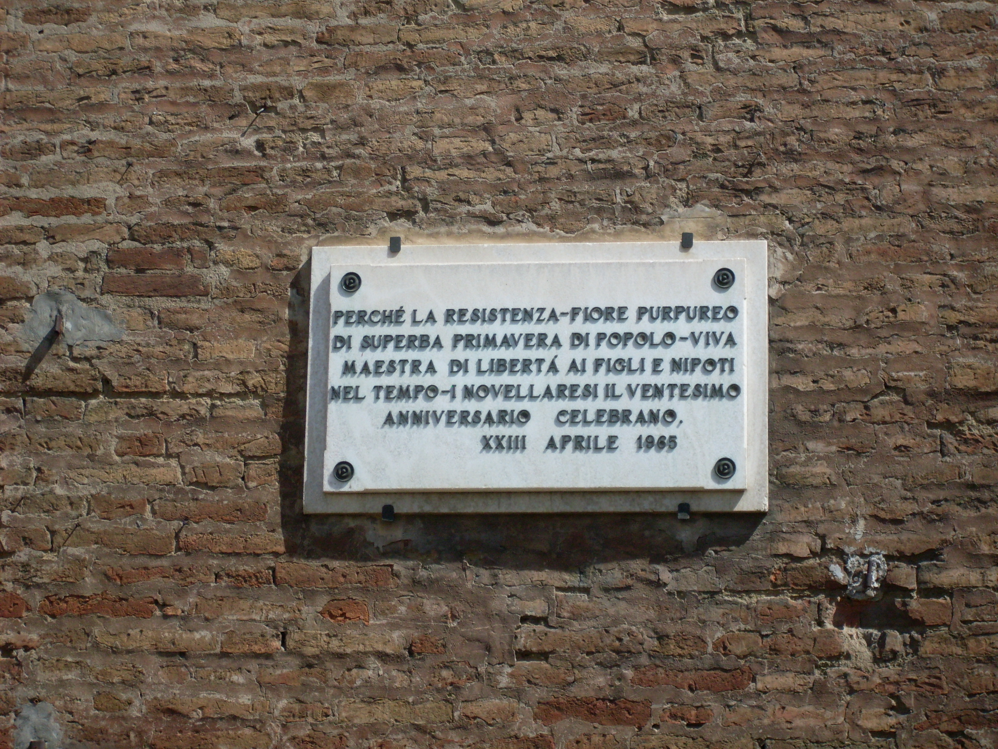 «PERCHE' LA RESISTENZA-FIORE PURPUREO/ DI SUPERBA PRI¬MAVERA DI POPOLO-VIVA/ MAESTRA DI LIBERTA' AI FIGLI E NIPOTI/ NEL TEMPO-I NOVELLARESI IL VENTESIMO/ ANNIVERSARIO CELEBRANO/ XXIII APRILE 1965»