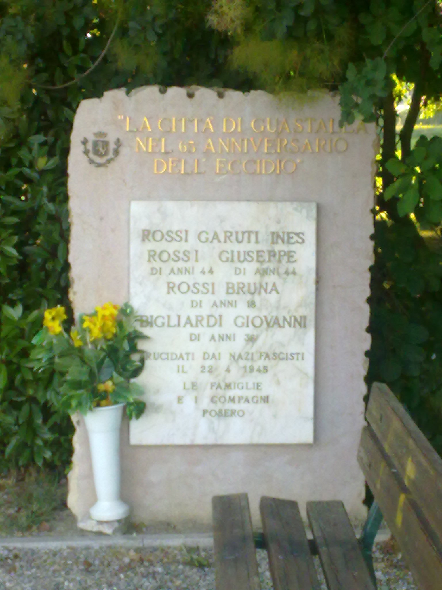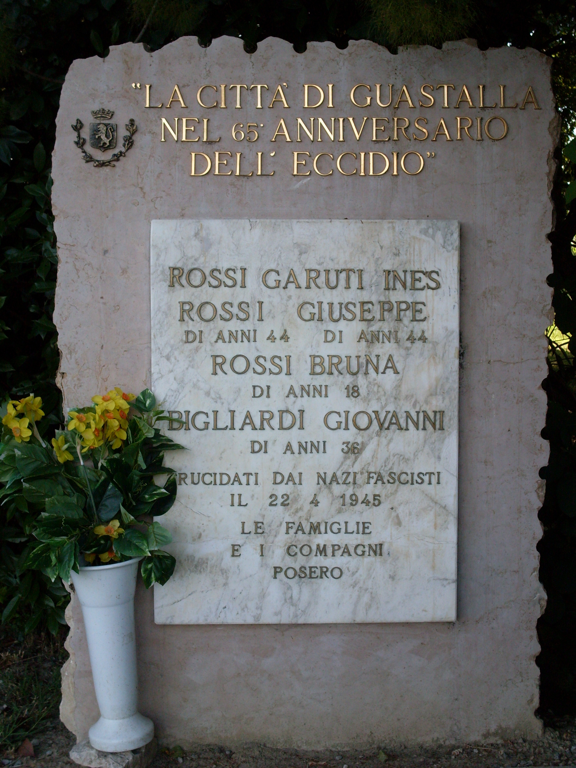 «ROSSI/ GIUSEPPE/ DI ANNI 44/ GARUTI INES/ ROSSI/ DI ANNI 43/ ROSSI BRUNA/ DI ANNI 18/ BIGLIARDI GIOVANNI/ DI ANNI 36/ TRUCIDATI DAI NAZIFASCISTI/ IL 23 4 1945/ LE FAMIGLIE E I COMPAGNI/ POSERO»