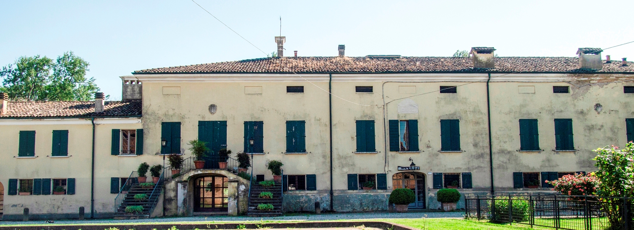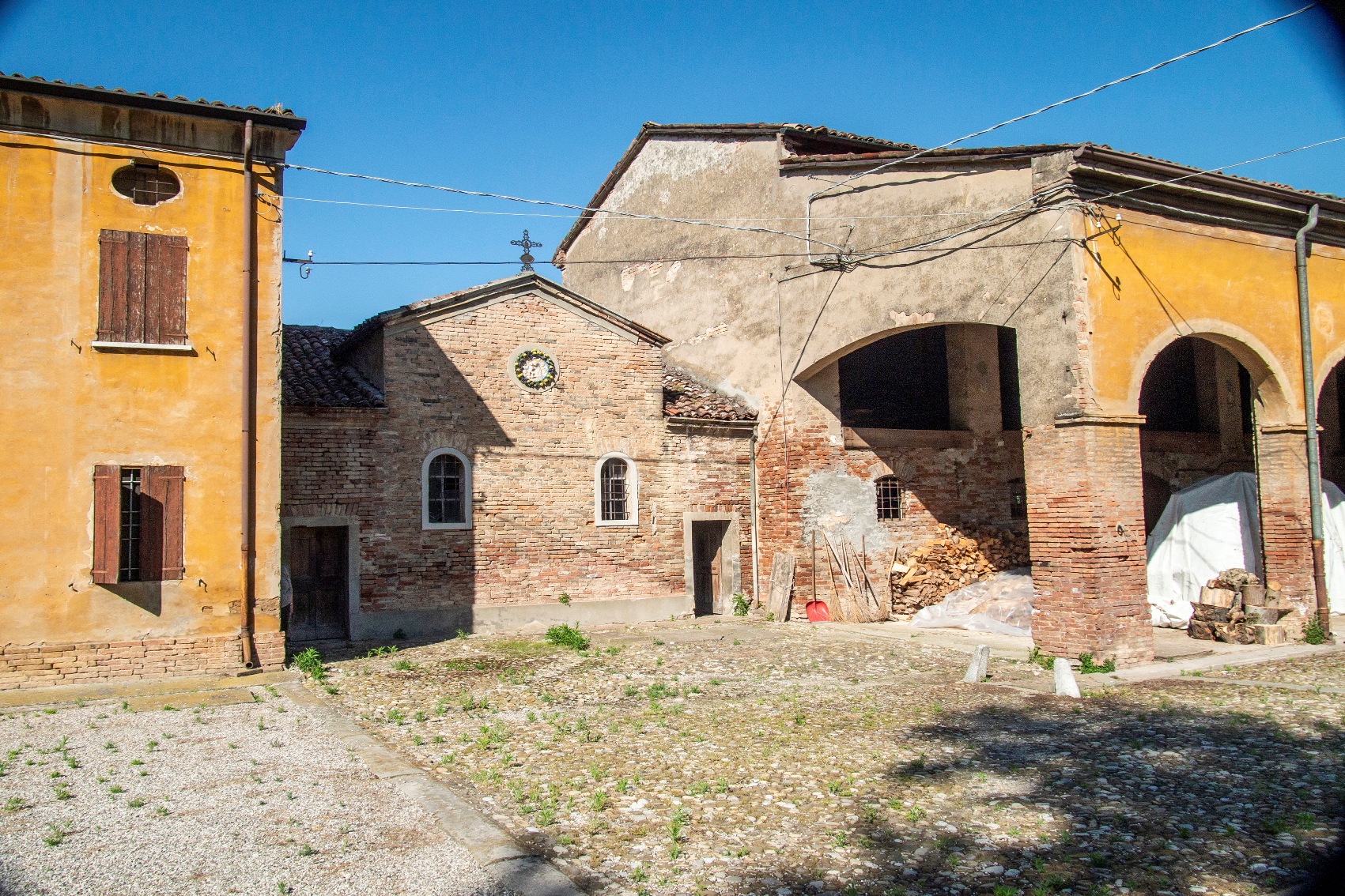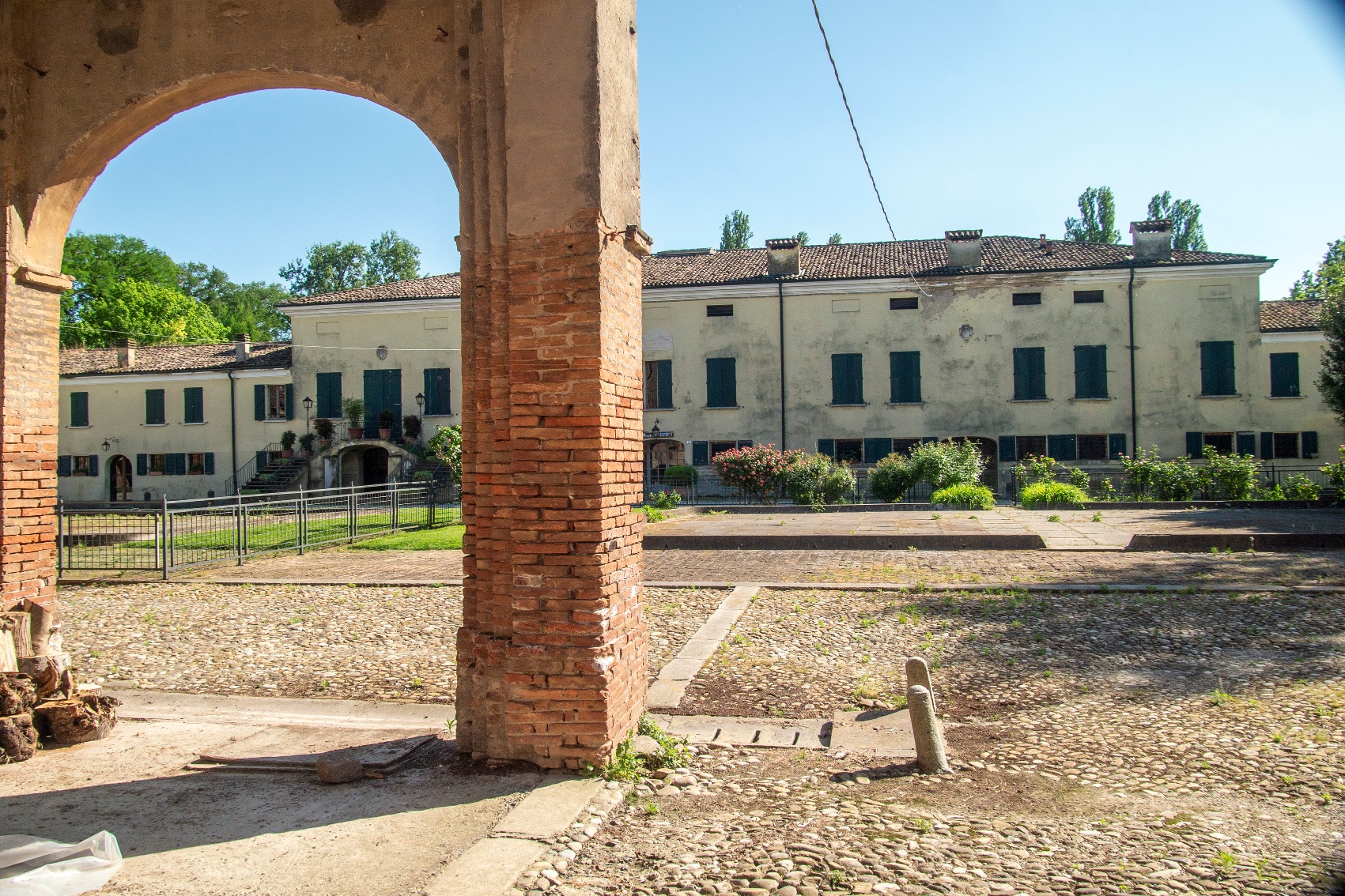 Il rustico, più basso, ha copertura a tre falde e portico a quattro luci, di cui una tamponata, a sesto ribassato.
