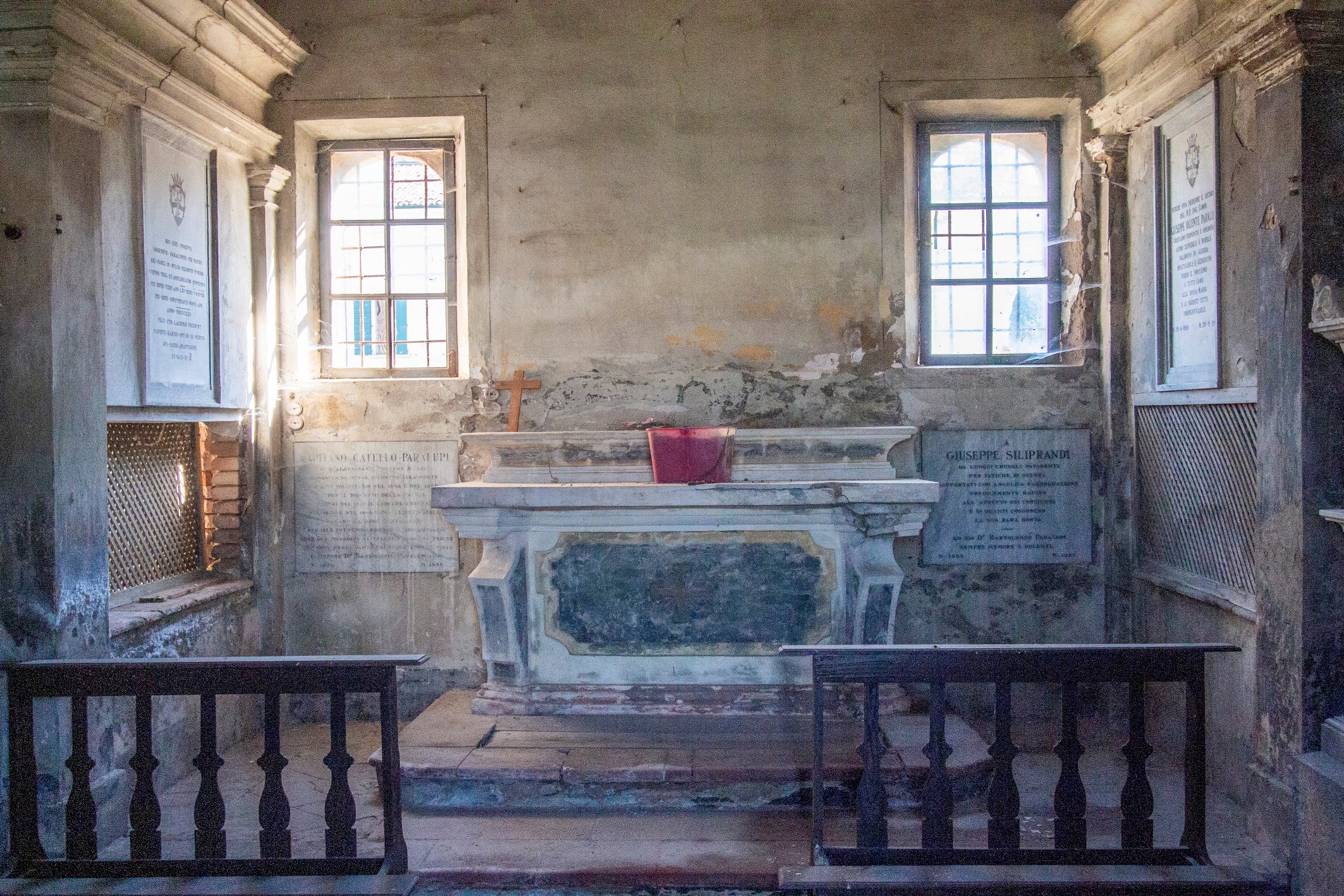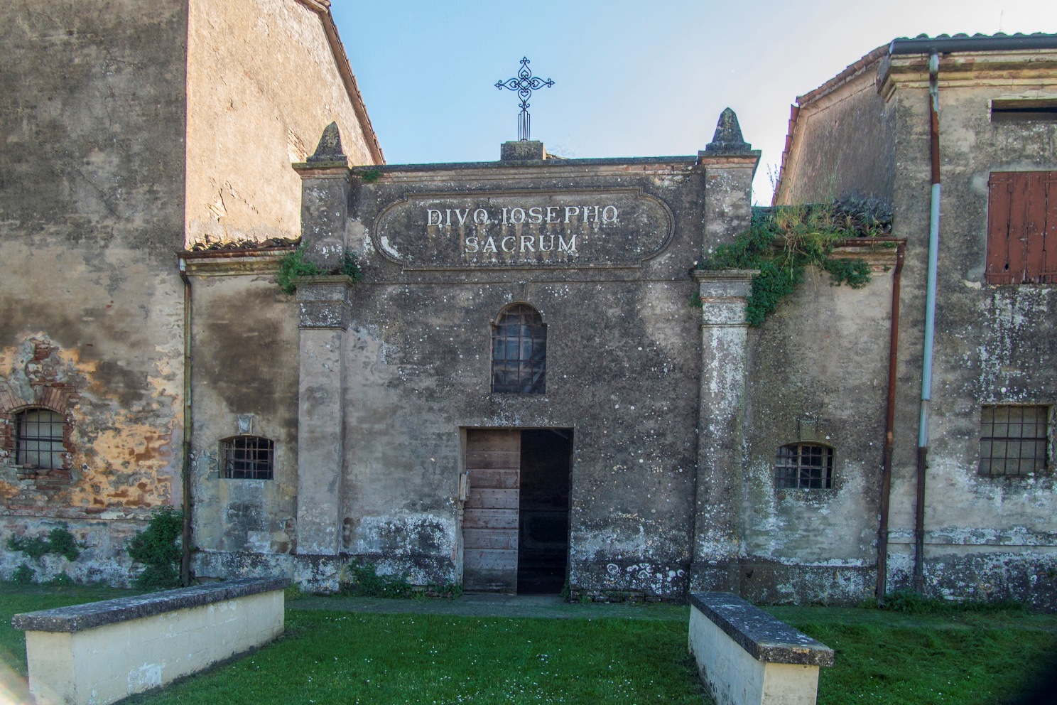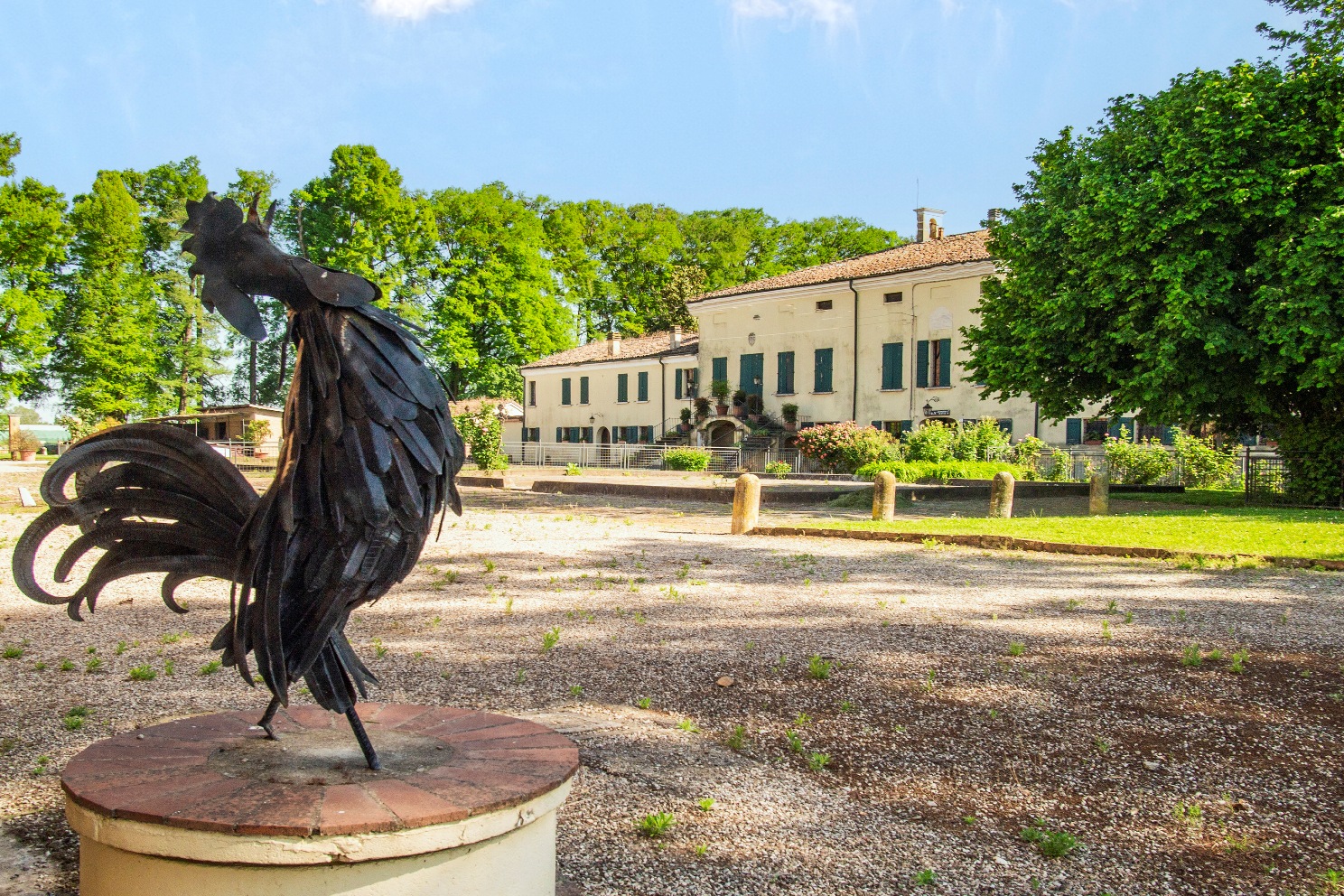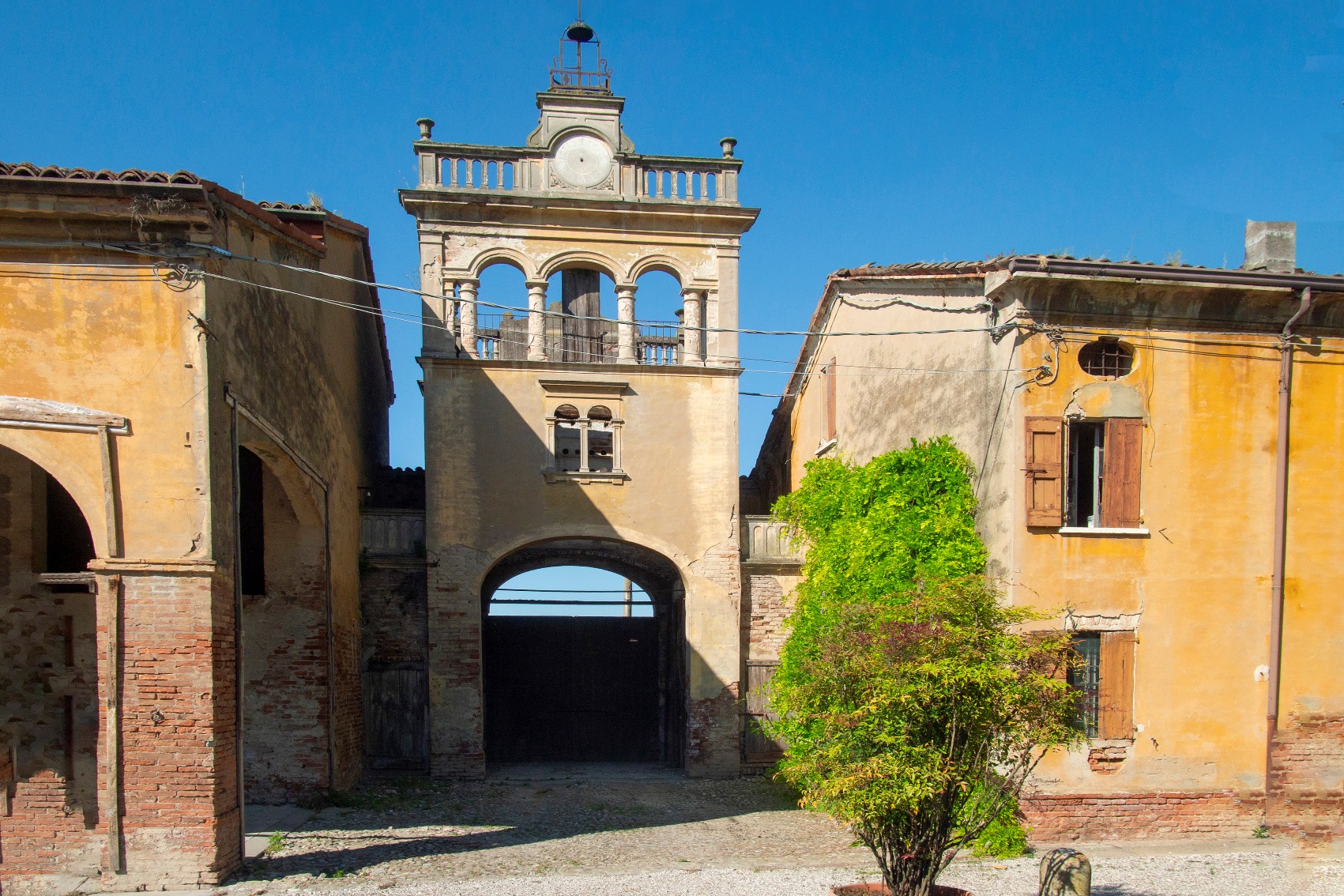 Il rustico, più basso, ha copertura a tre falde e portico a quattro luci, di cui una tamponata, a sesto ribassato.